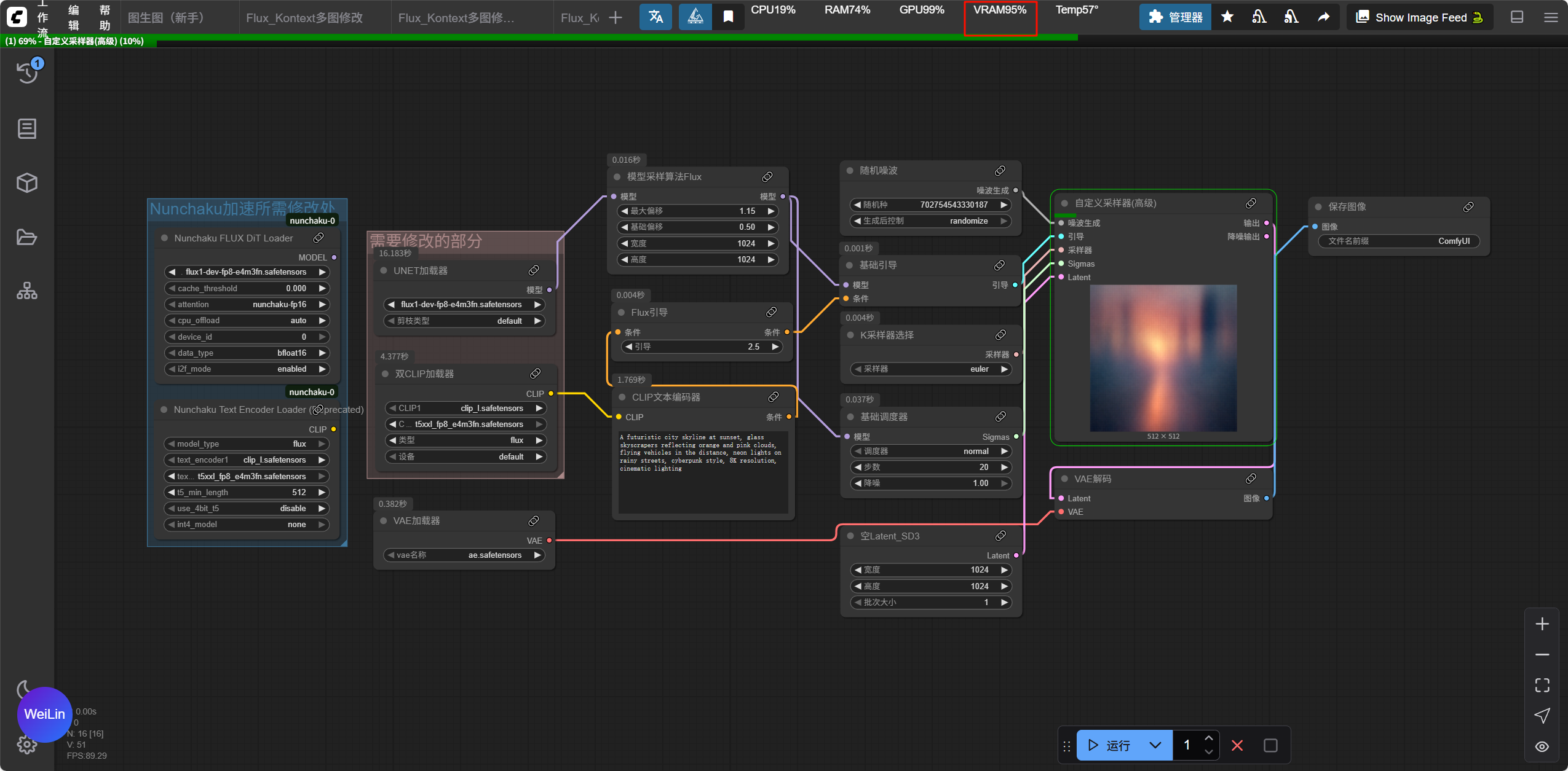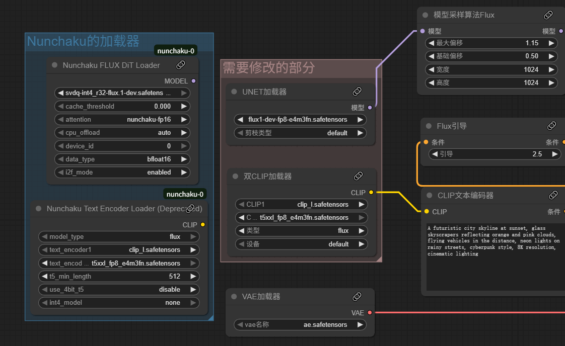 nunchaku的使用很简单,自己找或者搭建一个工作流,把主模型加载器和双Clip加载器改成nunchaku的就可以了