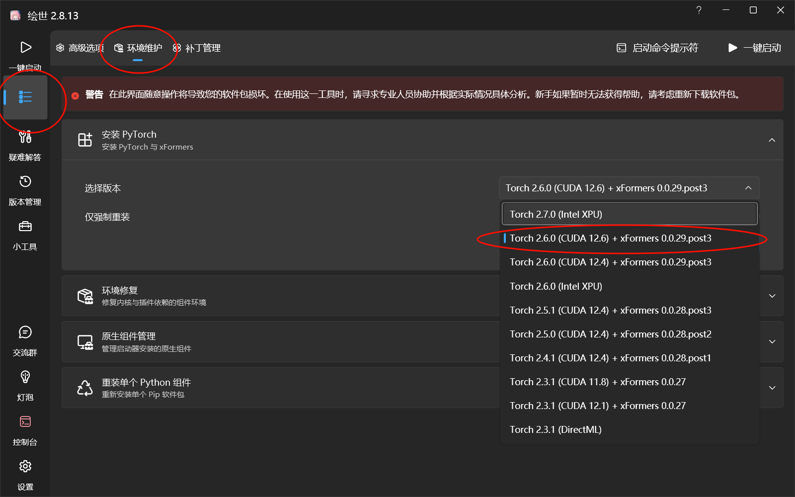 在启动器内一次点击高级选项→环境维护→选择“Torch 2.6.0 (CUDA 12.6) + xFormers 0.0.29.post3”→安装
