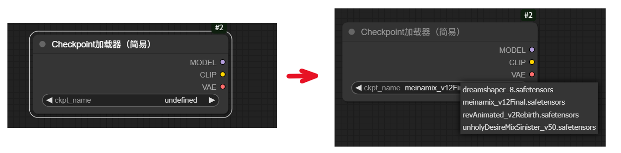 —重启ComfyUI,添加Checkpoint模型加载器节点,下图是修改前后对比