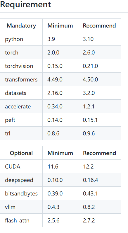 git clone https://github.com/hiyouga/LLaMA-Factory.git2.创建 anaconda 虚拟环境,根据官网环境要求选择Python版本(我这里用的是python 3.10)