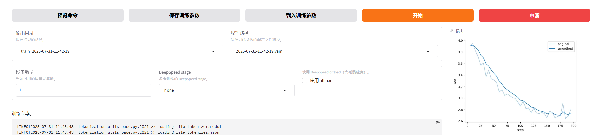 首先是看训练完成后的损失曲线的变化,观察最终损失。