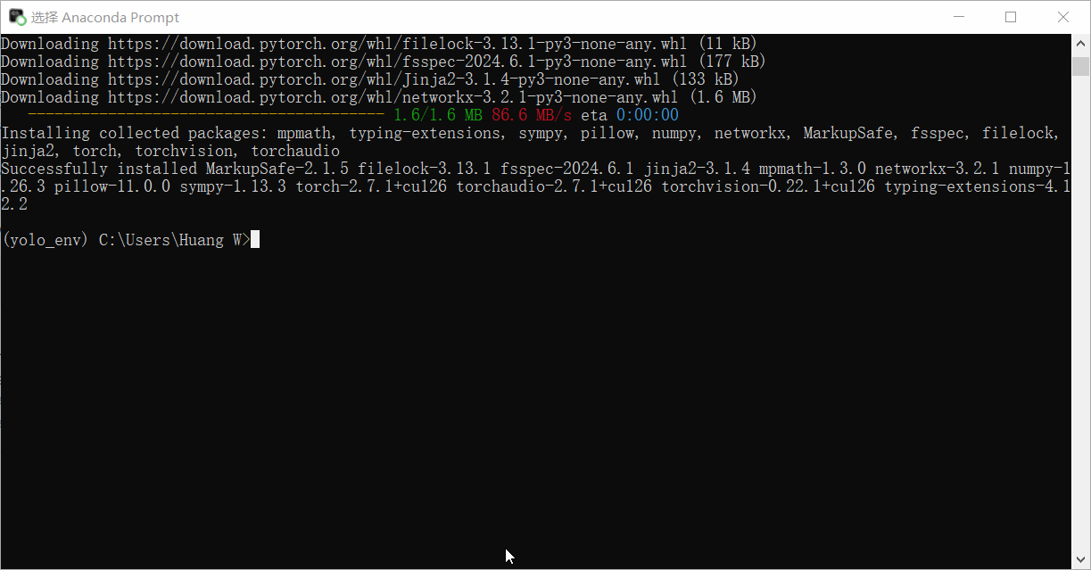 回到Anaconda的命令行,粘贴刚刚的复制的安装命令,等待pytorch安装;