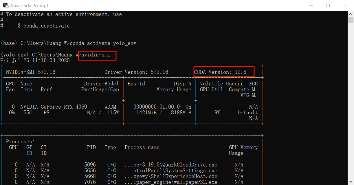 接着输入nvidia-smi命令查看自己的显卡支持CUDA的最高版本;