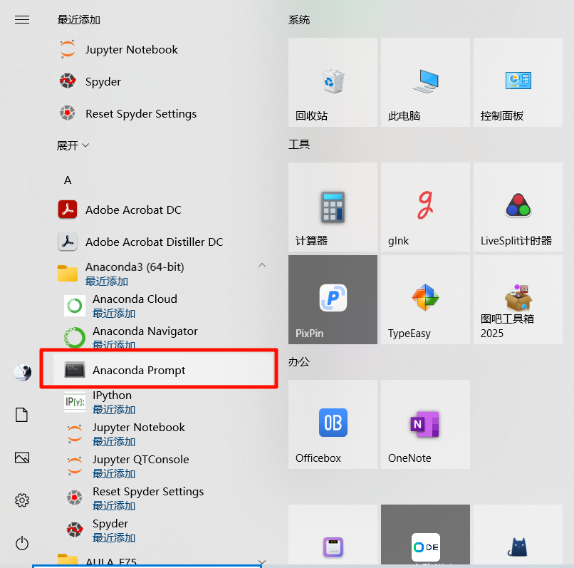 在开始菜单内找到Anconda3—>Anaconda Prompt,打开命令窗格