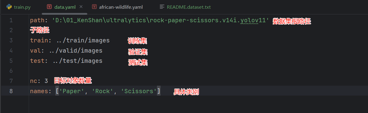 model.train(data=r'D:\01_KenShan\ultralytics\rock-paper-scissors.v14i.yolov11\data.yaml', #数据集配置文件地址