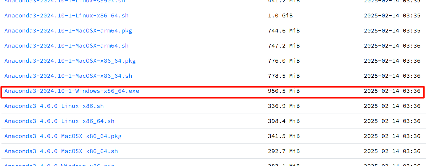 如果,官网太慢还可以选择清华的镜像网址(推荐,可以选版本),挑一个适合你的安装包https://mirrors.tuna.tsinghua.edu.cn/anaconda/archive/