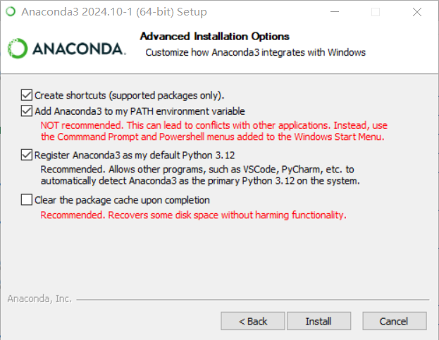 第一个是创建快捷方式(勾选,不然开始菜单没有Anaconda文件夹),第二个是加入环境变量(勾选),第三个是将 Anaconda 设为系统的默认 Python 3.12 解释器(勾选),第四个是安装完成后自动清理下载的缓存包,可节省磁盘空间(可勾可不勾),点击Install开始安装。